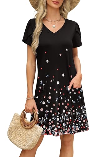 OFEEFAN Womens Summer Dresses 2025 Tulip Petal Short Sleeve V Neck Loose Swing Sundresses with Pockets Plain/Print