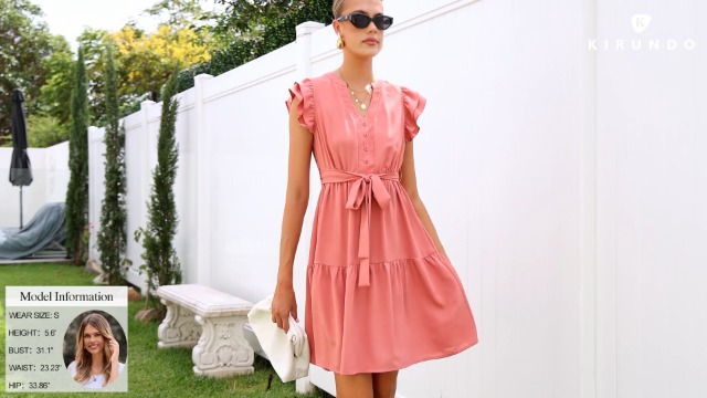 KIRUNDO Women Flutter Sleeve Summer Dress 2025 Spring V Neck Ruffle Flowy Tiered Knee Length Belted Beach Vacation Sundress
