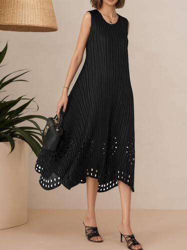 Summer Midi Dress for Women Round Neck Sleeveless Wrinkle-Free One Size Casual Outfits